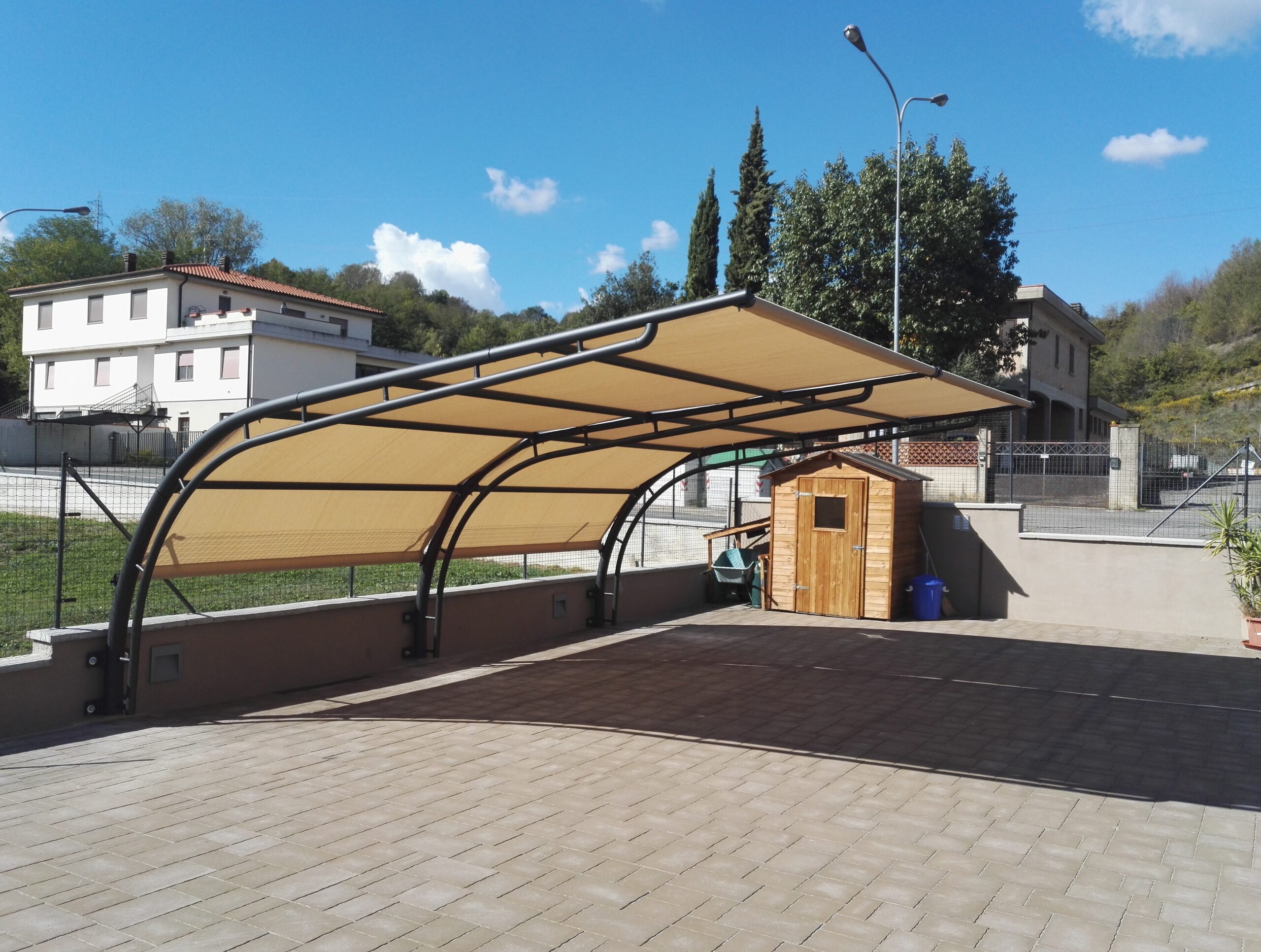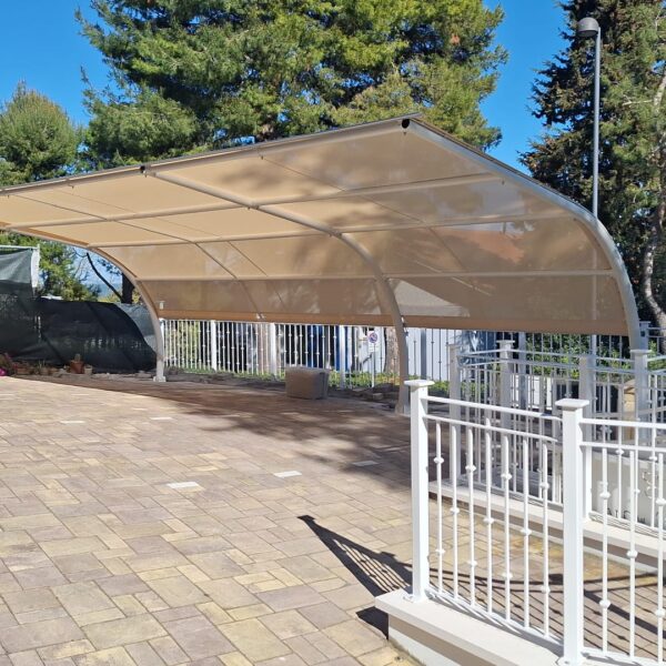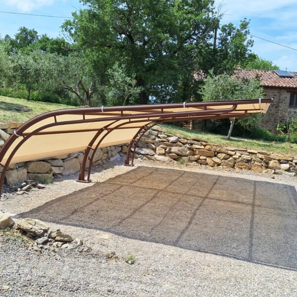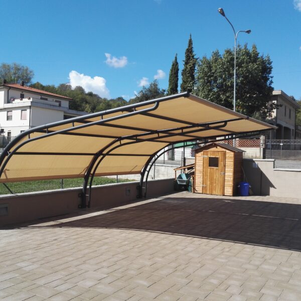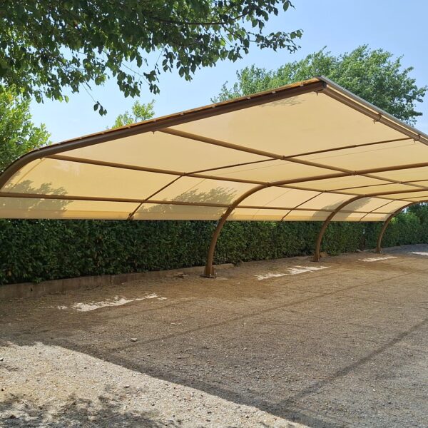 La copertura è realizzata con un telo in PVC microforato che garantisce un’eccellente protezione dai raggi solari, filtrando gran parte dell’irraggiamento e riducendo significativamente il surriscaldamento dell’abitacolo, senza appesantire visivamente la struttura.