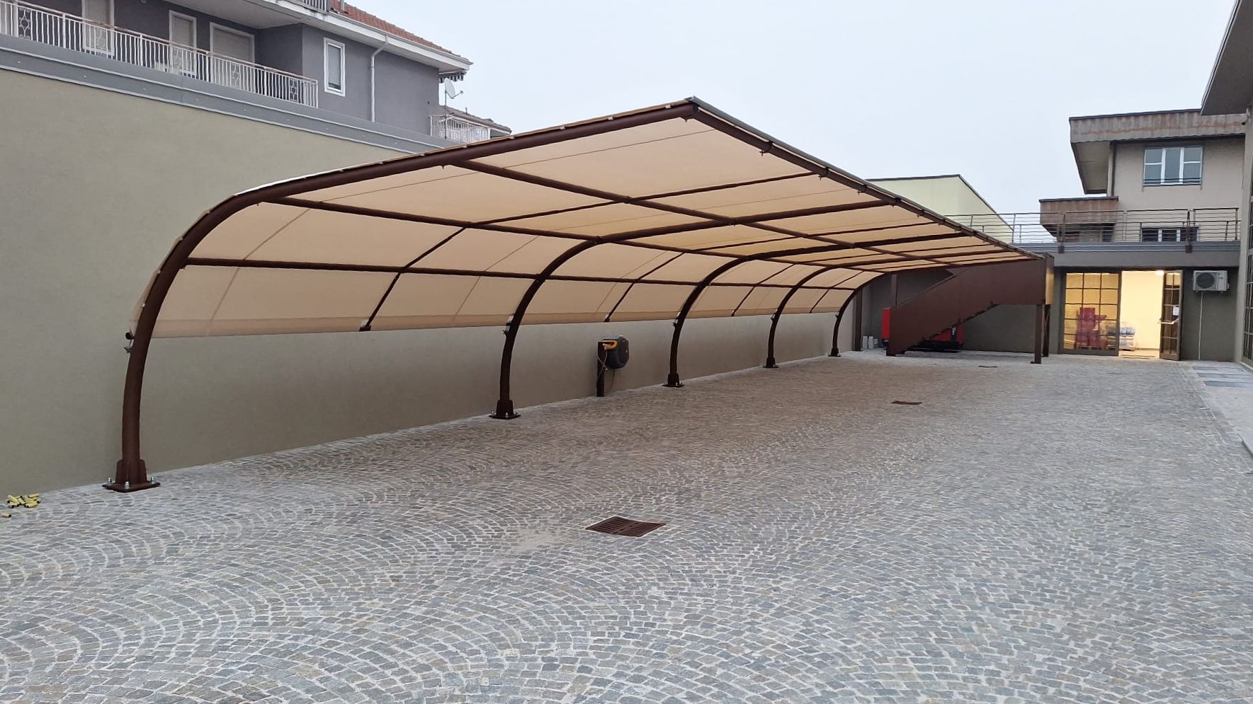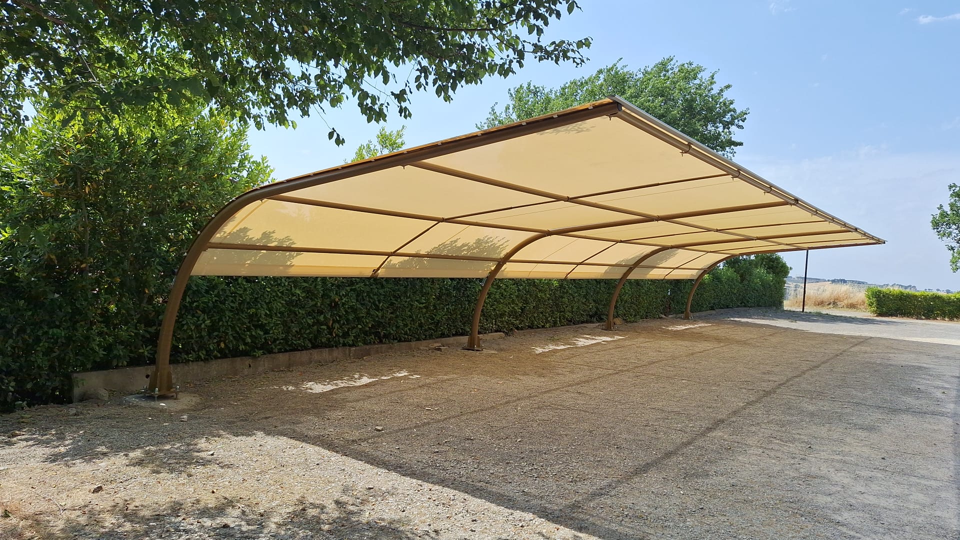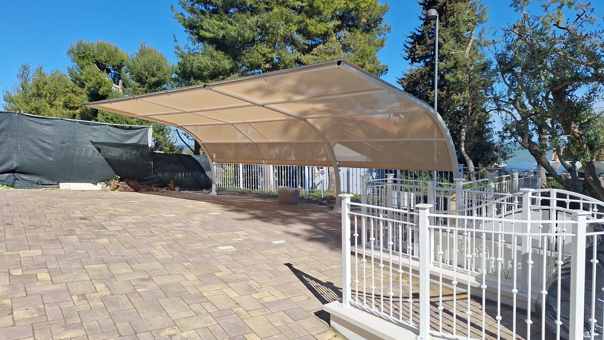 La copertura è realizzata con un telo in PVC microforato che garantisce un’eccellente protezione dai raggi solari, filtrando gran parte dell’irraggiamento e riducendo significativamente il surriscaldamento dell’abitacolo, senza appesantire visivamente la struttura.