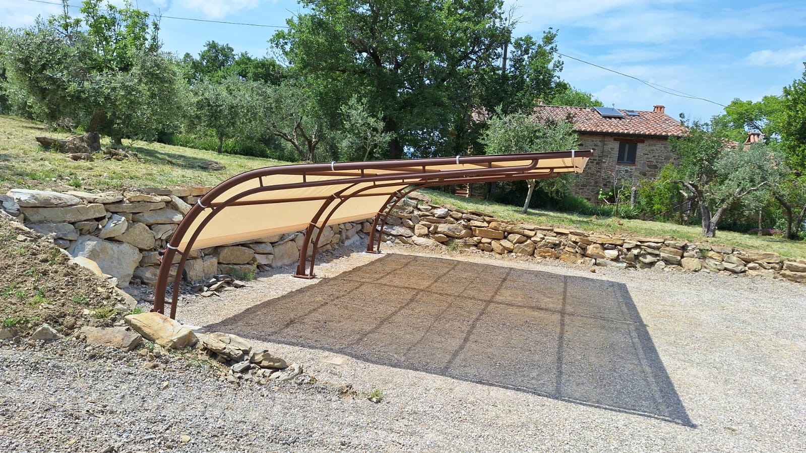La verniciatura permette di scegliere tra una vasta gamma di colori, così da integrare perfettamente la pensilina in contesti naturali, giardini, cortili e spazi esterni di pregio.